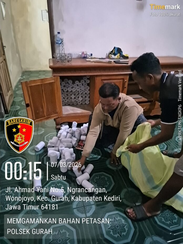 Borgolnews86.com || Kediri – Upaya menjaga keamanan masyarakat selama bulan suci Ramadhan terus dilakukan aparat kepolisian, Kapolsek Gurah melalui Kanit Reskrim Aiptu Subur SH bergerak Cepat mengamankan ratusan selongsong petasan yang diduga akan digunakan untuk produksi petasan rakitan, kegiatan tersebut berlangsung pada, Sabtu(7/3/2026)dini Hari.